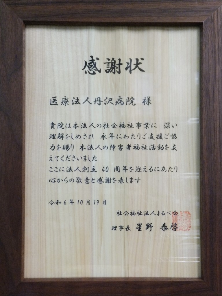 社会福祉法人よるべ会様より感謝状を頂きました。
